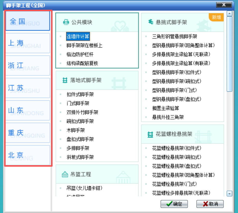 1、脚手架工程中,悬挂吊篮各模块,计算依据支持选择《JGJ202-2010》或《GB/T19155-2017》不同规范进行计算;